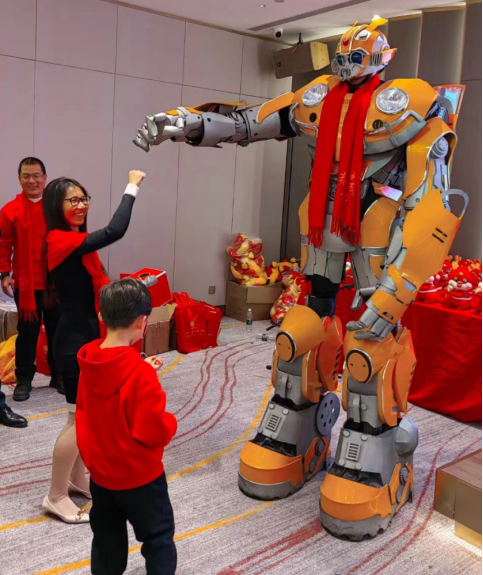 组委会精心准备的小黄蜂机甲成为全场的另一亮点,未来机甲风格的小黄蜂一亮相就引来现场宾朋纷纷合影留念,深得在场小朋友喜欢,小黄蜂经过变声处理的幽默互动应答,更是逗得参与观众哈哈大笑。