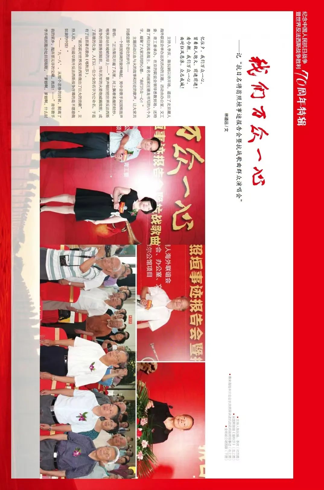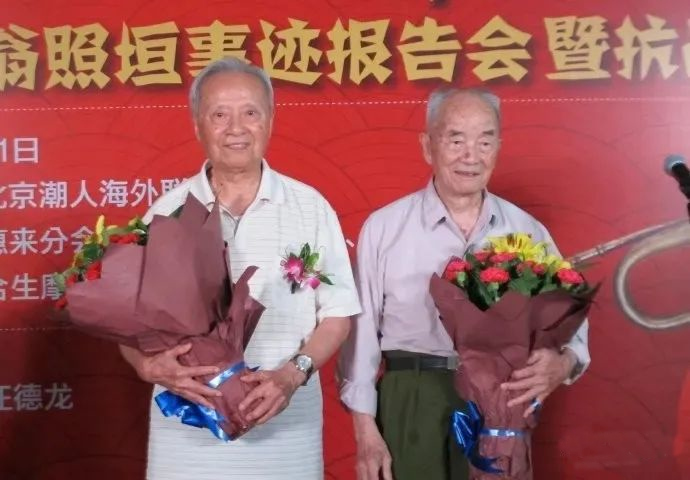 十年前,在纪念中国人民抗日战争暨世界反法西斯战争胜利70周年的时候,在京抗日老兵巫志远(上图右)、许南明(上图左)二位老同志与在京潮汕乡亲一起参加了《抗日名将翁照垣事迹报告会暨抗日歌曲群众演唱会》并上台接受乡亲们敬献的鲜花。当我们迎来又一个逢十纪念的时候,这两位老同志已经走远,但在京潮人不会忘记这些抗日老战士、老同志为反抗侵略、国家独立、民族解放而舍身忘死的功勋,他们的精神始终激励着我们在强国建设、民族复兴的新征程上继续前行!
