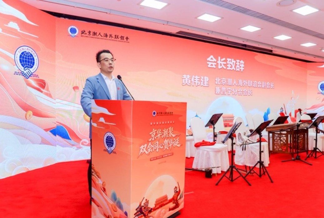 北京潮人海外联谊会副会长兼普宁分会会长黄伟建致欢迎辞并做工作汇报,黄伟建会长在发言中表示,值此双节同庆,他代表普宁分会欢迎并感谢各位乡亲及支持者。其入会初衷源于20年前作为“京漂”在联谊会中感受到的家人般温暖,因此希望服务好在京潮汕人,让他们在遇到困难时有依靠,在佳节感受到归属。此次大型聚会虽筹备不易,但潮汕人团结互助的精神令人感动,年轻乡亲的热情与责任担当让他看到联谊会未来希望。最后,他送上三重祝福:愿祖国繁荣昌盛、国泰民安;愿潮汕家乡风调雨顺、兴旺发达;愿联谊会在乡亲共同努力下会务昌隆、越办越好。