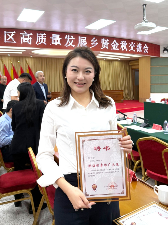 随后,澄海区人大常委会主任肖永彤代表区政府正式向首批13位“澄海形象推广大使”颁发了聘书,期望他们能充分发挥自身影响力,传播澄海声音,讲好澄海故事。北京潮人海外联谊会澄海南澳分会作为重要的宣传窗口,澄海南澳分会文化艺术顾问、中央广播电视总台原主持黄今,澄海南澳分会文化艺术顾问、视频号流量博主林曼,以及澄海南澳分会副秘书长陈淑淇等三位光荣地获得首批“澄海形象推广大使”聘书。