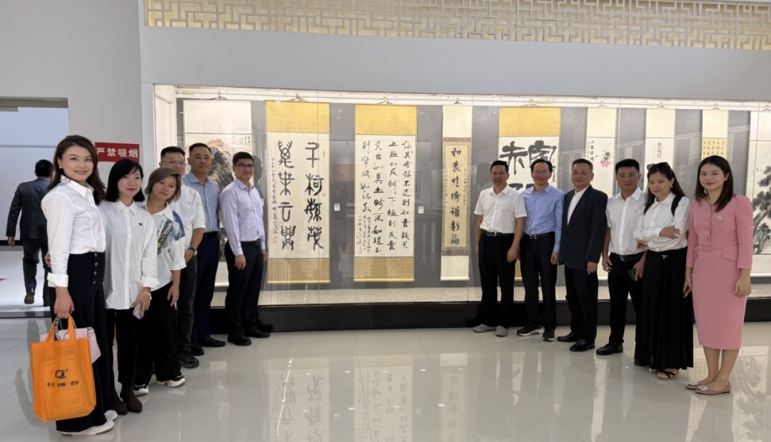 参加本次交流会的各位代表会后还一同前往澄海博物馆参观第四届“澄怀逸兴”海内外澄籍乡亲书画作品展。澄海南澳分会各位代表在本会前期选送参展的蚁美泰大校、蔡帆博士、黄湘文硕士的作品前合影留念。