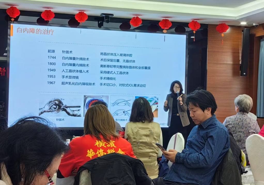 活动开始前,由爱博诺德(北京)医疗科技股份有限公司培训师李婷婷硕士为大家开展《中老年常见眼病预防》健康讲座。她用通俗易懂的语言,结合老年人特点和案例,详细讲解老年人白内障成因、症状、如何诊断和治疗以及怎样预防,还与部分老人就青光眼、干眼症等情况进行互动并耐心解答。