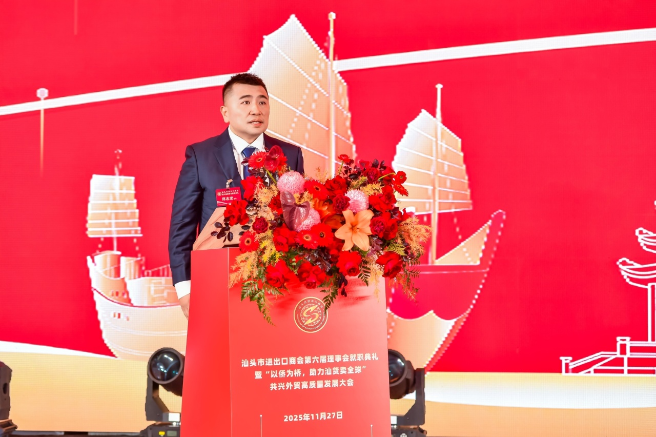 在就职典礼上,新当选的汕头市进出口商会会长邱志宏先生代表第六届理事会致辞。他表示,将与理事会全体同仁守正创新、团结奋进,新征程聚焦两大核心目标:其一,聚侨力、联全球,让潮商成为汕货出海的“摆渡人”;其二,兴汕货、强产业,推动传统产业升级,助力汕头外贸扬帆全球。