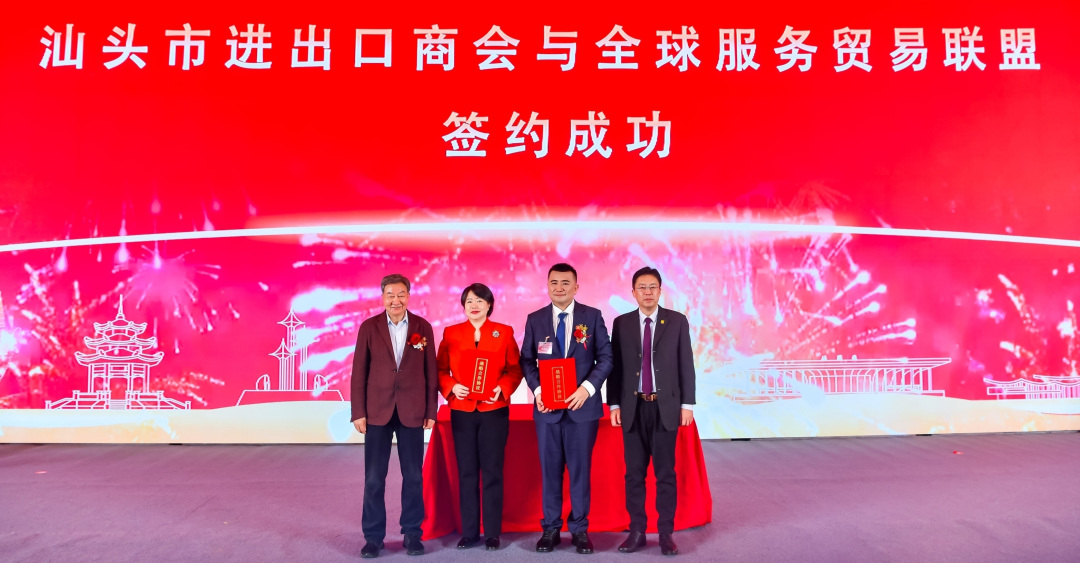 大会现场举行了多项重要活动,其中最引人注目的是两项重要签约仪式。汕头市进出口商会分别与全球服务贸易联盟签署战略合作框架协议,与泰国泰华进出口商会签署《落实两地长期战略合作之 2026-2030 年经贸对接框架协议》。