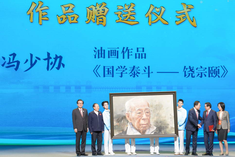 大会举行了作品赠送仪式:第二十三届国际潮团联谊年会筹委会向国际潮团总会赠送潮绣作品《归潮》作为留念;广东省美术家协会副主席、广东画院原副院长冯少协向潮州市饶宗颐博物馆捐赠油画作品《国学泰斗——饶宗颐》。