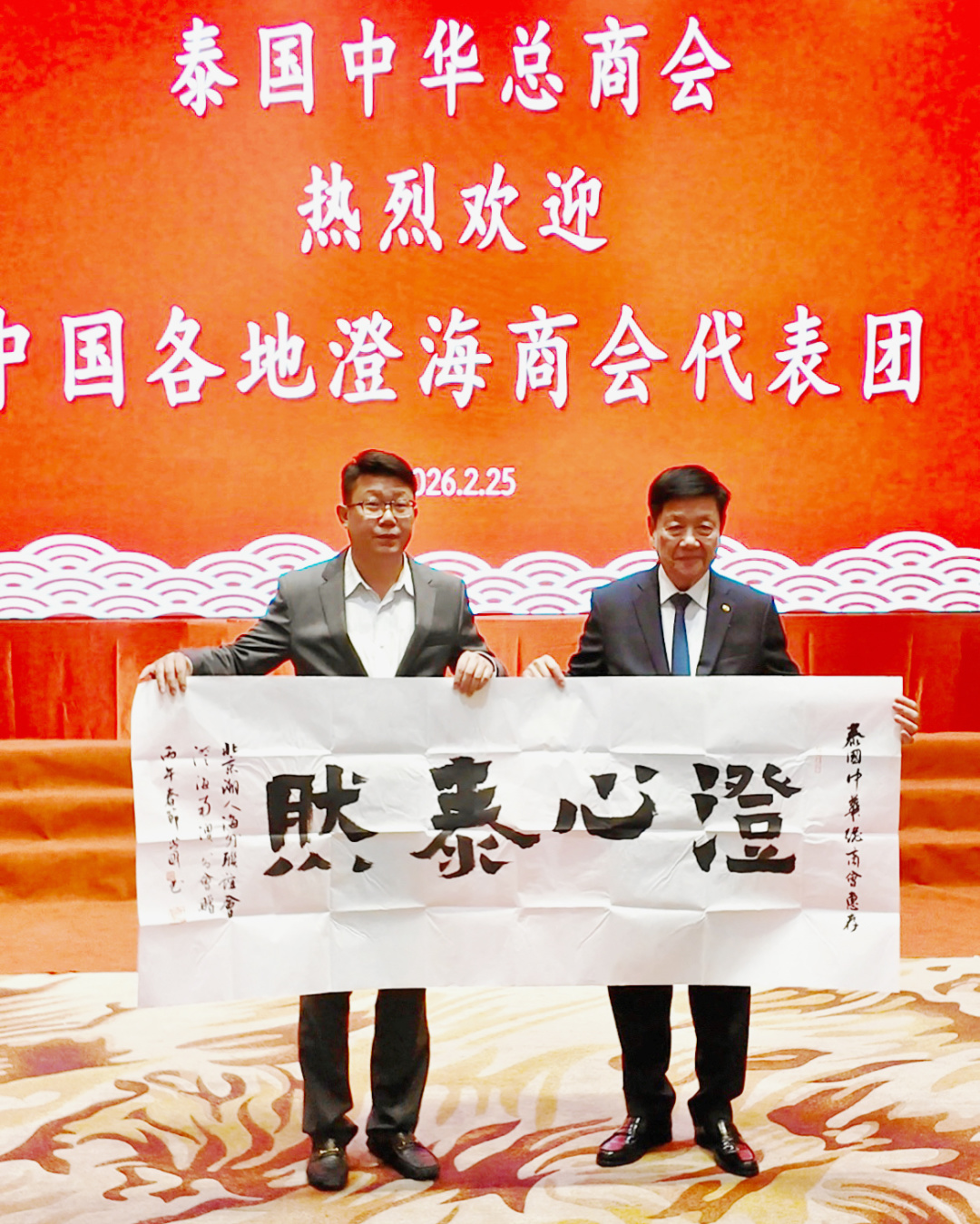 2026年2月25日,北京潮人海外联谊会澄海南澳分会执行会长余锦生、文化艺术顾问黄今等一行,应邀出席泰国澄海同乡会第35届理事会就职典礼。泰国各界侨团代表、海内外澄海籍社团代表齐聚曼谷,共叙乡情、共贺新届、共襄盛举。